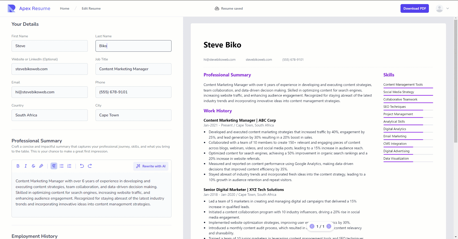 Never get stuck again, let AI assist you when you are unsure of how to put things. Apex Resumes allows you to harness the power of AI in your quest to get hired.